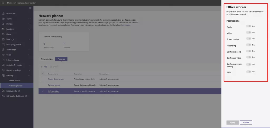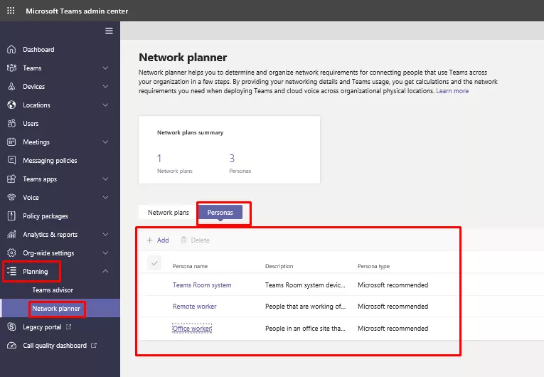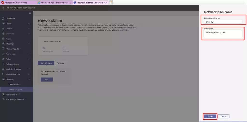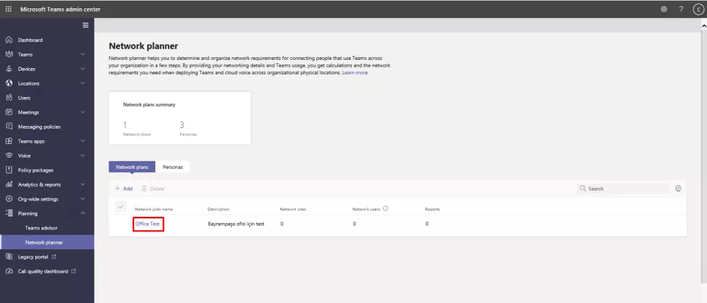 “Microsoft Teams Admin paneline” giriş yaparak başlıyoruz. Network planner raporu oluşturmak için kullanıcı profillerinizi kendiniz oluşturabilirsiniz. Varsayılan olarak gelen profillerde Teams room System, Remote worker ve Office worker kuralları bulunmaktadır.