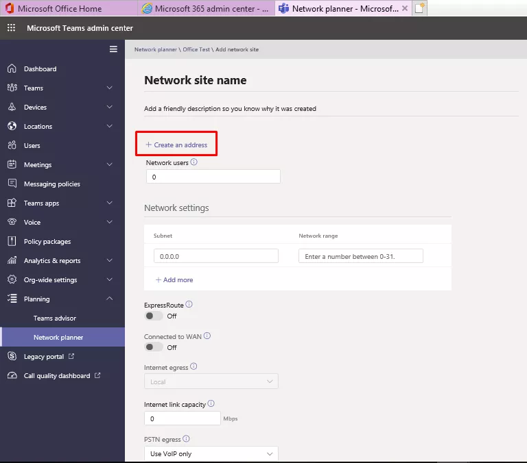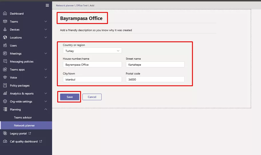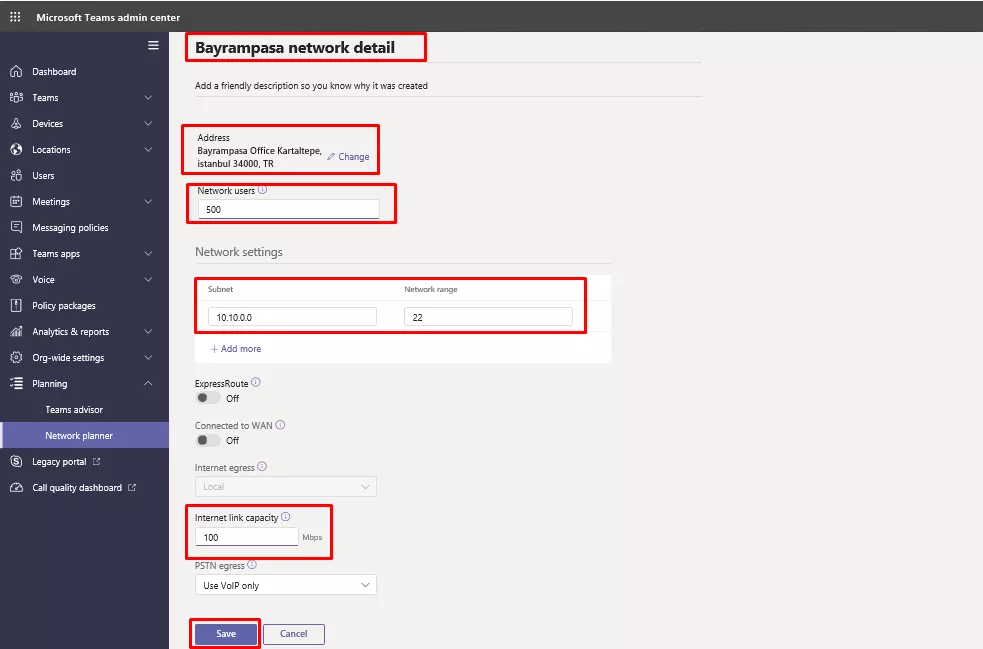 Kuralımıza isim giriyoruz. Oluşturduğumuz adreste olan Teams kullanıcısı âdetini giriyoruz. Network settings alanından network bilgimizi giriyoruz. Yapınızda “ExpressRoute” ve “MPLS” devreniz varsa ilgili alanları aktif ederek network detaylarınızı girebilirsiniz. İnternet hızınızı “Internet link capacity” alanına giriş yapıyoruz. Teams üzerinden PSTN entegrasyonu kullanıyorsanız “PSTN egress” alanından seçerek “Save” butonu ile işlemleri tamamlayabilirsiniz.