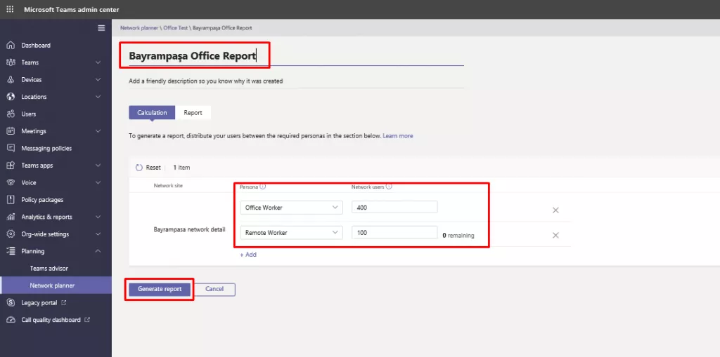 Raporumuz için isim verdikten sonra “Calculation” alanından kullanıcı profilimizi düzenliyoruz. Kendi oluşturduğunuz profilleriniz varsa “+ Add” butonunu kullanabilirsiniz. Kullanıcı adetimizde 500 kişi olarak giriş yaptığımız için bu alanda 500 kişilik bir profil geldi. Office içi kullanıcı âdetimiz 400, Office dışı kullanıcı âdetimiz 100 olarak giriş yaptıktan sonra “Generate report” butonu ile raporumuzu oluşturuyoruz.