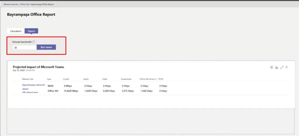 Oluşan raporda Networkünüzün % kaç kullanımını Teams servisi için ayırmak istediğinizi seçerek yeterlilik durumunuzu kontrol edebilirsiniz.